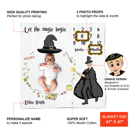 [Personalized] Endanzoo Baby Monthly Milestone Muslin Swaddle Blanket (Flying Wizard)