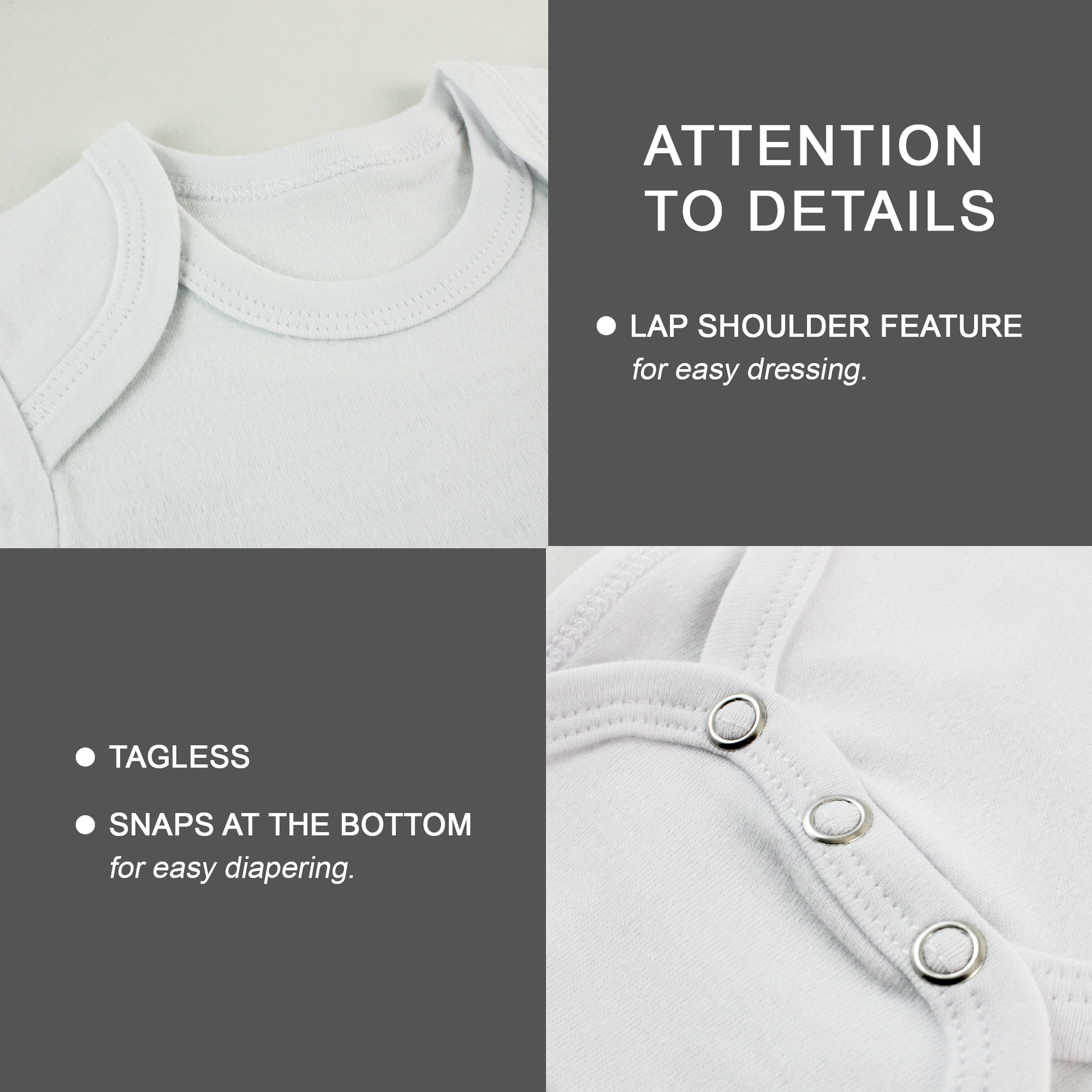 - Easy on and off lap shoulder bodysuit.